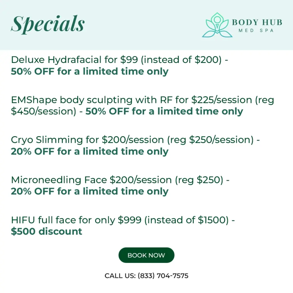 Your journey at Body Hub Med Spa begins with a thorough assessment, where we learn about your goals and design a customized plan just for you. Experience the difference that advanced technology, compassionate care, and transparent pricing can make. Whether you’re focused on body sculpting, skin rejuvenation, or a comprehensive wellness plan, our team is ready to help you look and feel your best.